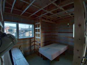 今回ご覧いただけるのは、アップルゲート社のセルロース断熱の家の施工現場です。