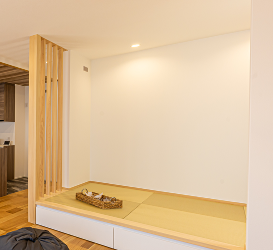 ちょっと横になったり、子どもの遊び場にしたり、お客様をお通ししたり。フラットなリビングとは違う、多目的に使える便利な空間です。