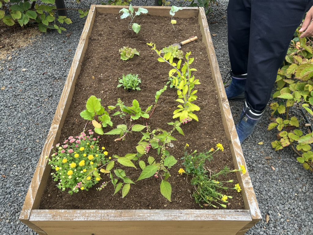 先日、高松事務所のキッチンガーデンスペースに新しい花や苗を植え替えました。