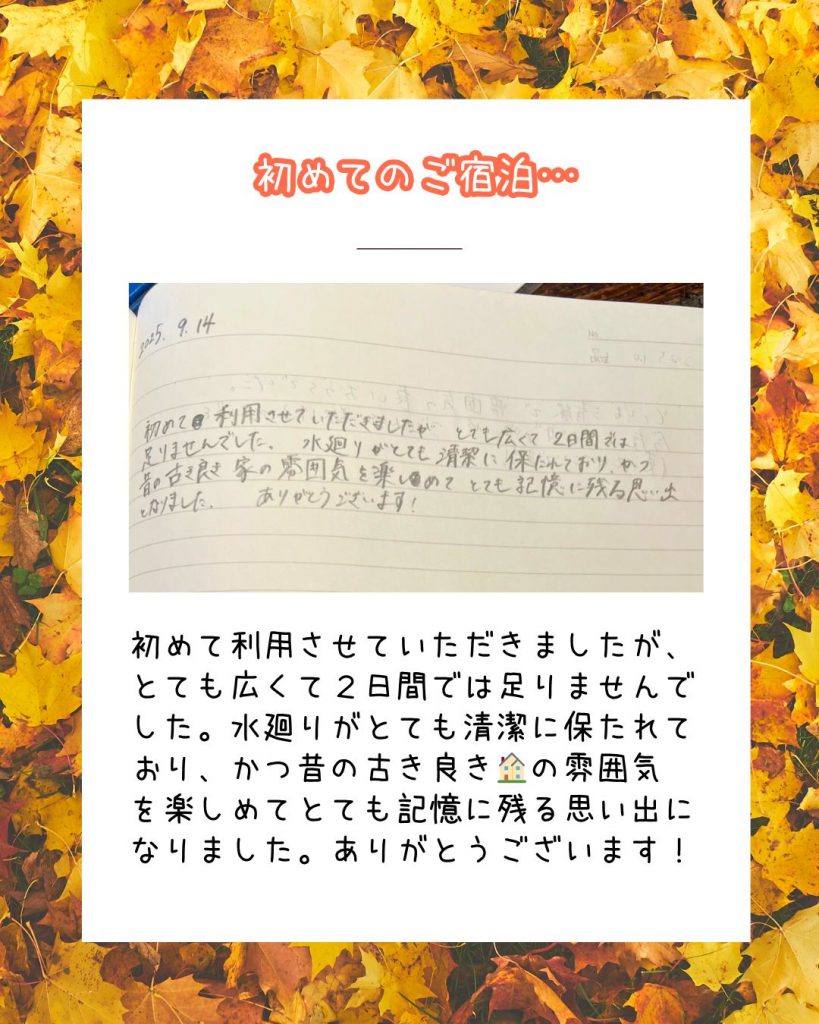 これからも、たくさんの方に気持ちよくお過ごしいただけるよう、しっかり維持管理に努めてまいります。ご宿泊の際には、ぜひ自由ノートに感想や思い出をひとこと残していただけると嬉しいです✨