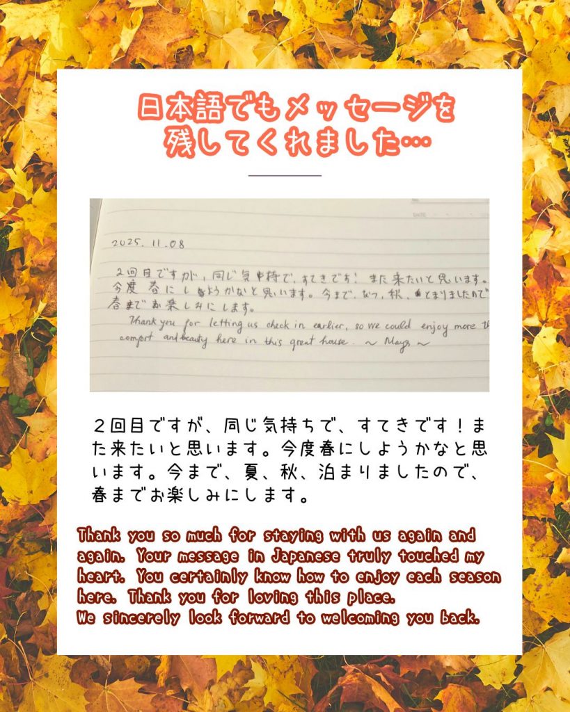 We will continue to strive diligently to maintain and manage the property so that many more guests can enjoy a pleasant stay. When you stay with us, we would be delighted if you could leave a few words of your impressions or memories in our guestbook ✨