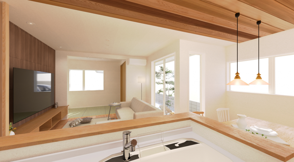 キッチンは対面式で、リビングと畳コーナーを同時に見渡せます。お子様が遊んでいても、料理の手を止めずに視線と気配がつながります。畳コーナーはリビングの延長として使える床座スペース。遊び場にも、お昼寝にも、家族のくつろぎにも無理なく馴染みますね。
