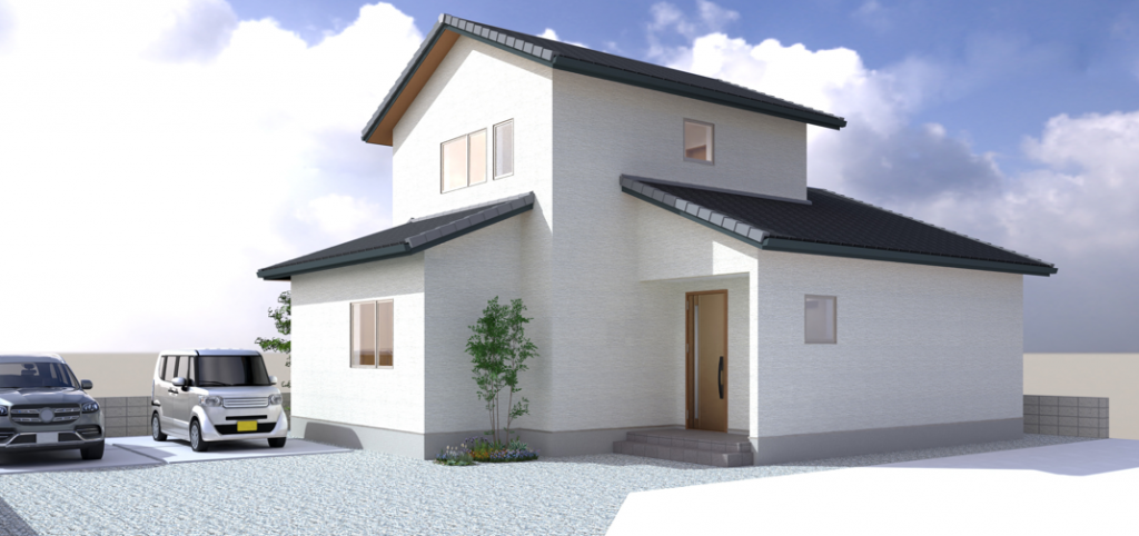 すっきりしたデザインの切妻屋根の二階建て。駐車スペースもゆったりとしています。