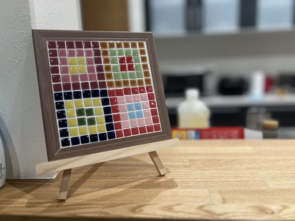さらに驚いたのは、夏休みに開催する弊社イベント「親子木工教室」で皆さんが作られたモザイクタイルアートが、キッチンカウンターの上に飾られていたこと。