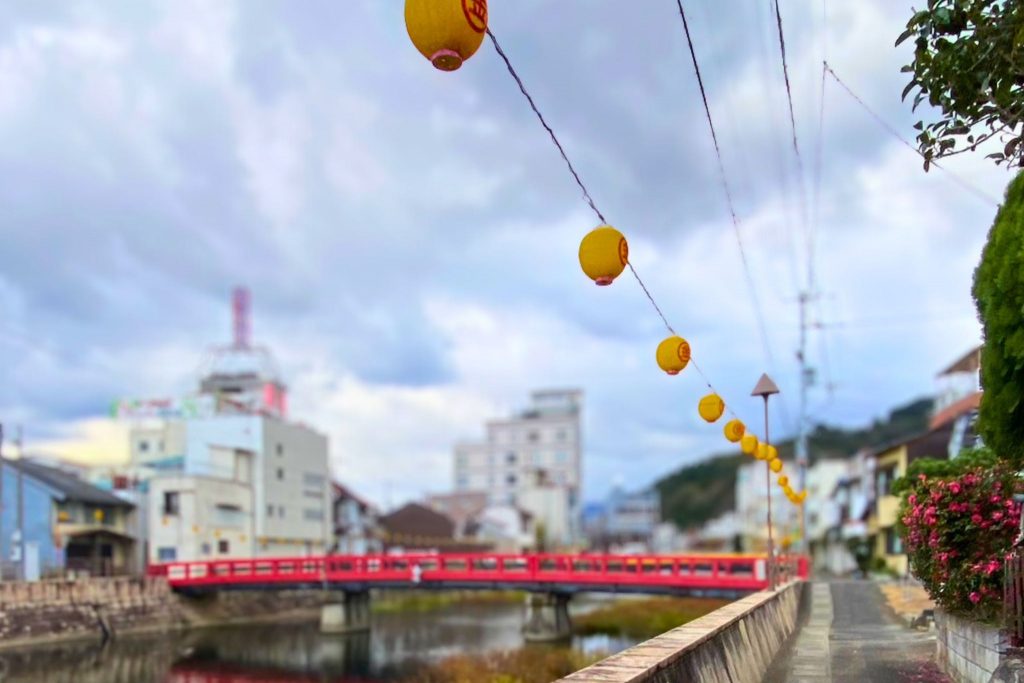 ▲金マークの黄色い提灯が並ぶ川沿いを歩いて参道まで…