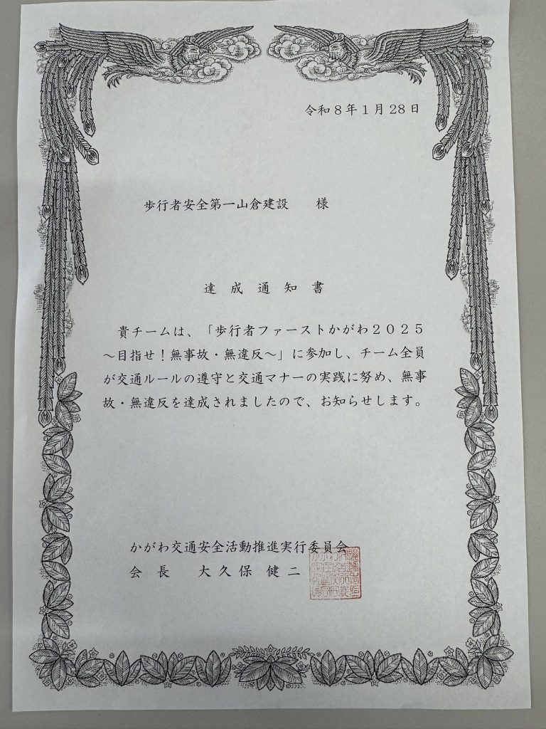歩行者ファーストかがわ2025にエントリーし、担当メンバーが交通安全を守り、無事故で業務を出来ましたので、表彰いただきました。
