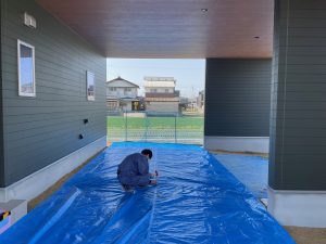 明日からの見学会に向けて、弊社新入社員の小松くんが先輩と一緒にブルーシート養生を